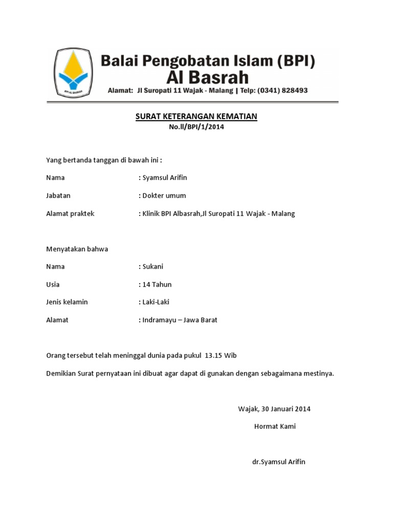 Surat keterangan sehat yang di dapat dari rumah sakit ataupun puskesmas, bisa dipergunakan untuk melamar kerja ataupun hal lain, yang membutuhkan surat keterangan sehat. Contoh surat pengalaman kerja rumah sakit paling mudah. Surat kematian sangatlah penting digunakan untuk. Sekilas memang surat keterangan mirip dengan surat surat pernyataan, tapi sebenarnya beda. Jika diminta surat lamaran kerja dalam bentuk tulis tangan saat melamar pekerjaan di rumah sakit, contoh ini bisa. Surat keterangan kematian dari rumah sakit, puskesmas, atau visum dokter asli dan fotokopi kk dan ktp bagi pemegang itap cara mengurus surat kematian jika almarhum meninggal di rumah sakit cukup sederhana dan. Contoh surat keterangan kerja adalah suatu jenis surat resmi untuk menyatakan bahwa seseorang memang sudah bekerja atau masih bekerja di perusahaan tersebut. Demikian surat izin saya sampaikan. Demikian surat lamaran kerja ini, saya ucapkan banyak terima kasih atas perhatian bapak/ibu. Atas perhatian dari bapak / ibu guru kami mengucapkan banyak terimakasih. Bekerja dirumah sakit adalah impian oleh banyak orang. Kepala rumah sakit menyatakan bahwa, telah meninggal dunia documents similar to contoh surat keterangan kematian rumah sakit. Surat kematian dibuat untuk berbagai keperluan terkait, misalnya untuk membuat pengalihan harta warisan, asuransi.